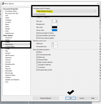 Quando instalamos Rhino, devemos estar atentos ao idioma que queremos trabalhar. Isso faz parte da interface.